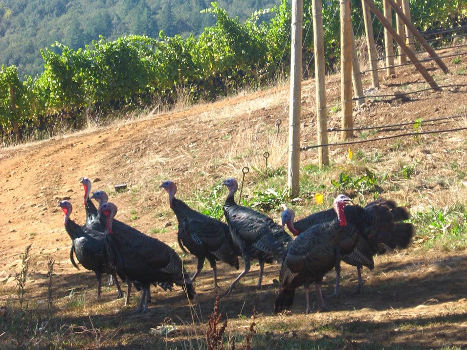 Pests are managed with the help from our free range Turkeys who also roam our vineyards. This reduces the need for unnecessary pesticides on our grapes. You will see the turkeys wandering around the cellar door as well as some of them roost in the large gum tree out the front each night.